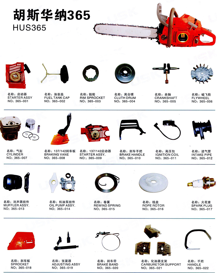 The following parts for general model HUSQVARNA 365 chain saws which are produced in China,frankly speaking,all the inner parts are same except for the outer shape parts,These models are copied from Komatsu model HUSQVARNA 365.